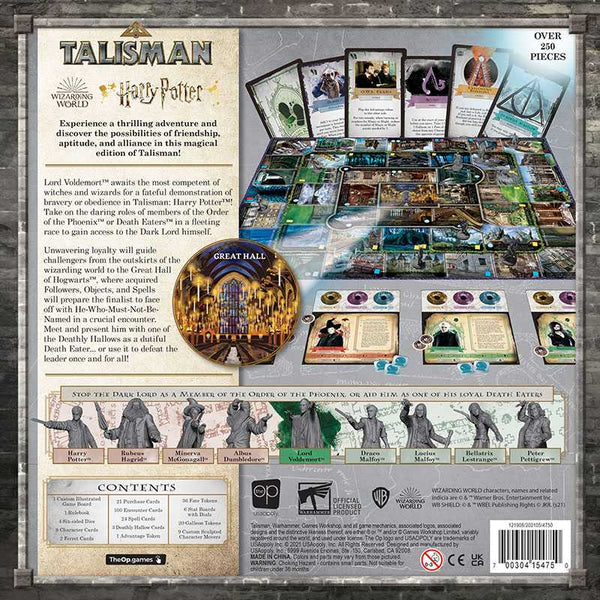 Lord Voldemort™ awaits the most competent of witches and wizards for a fateful demonstration of bravery or obedience in Talisman: Harry Potter™! Take on the daring roles of members of the Order of the Phoenix™ or Death Eaters™ in a fleeting race around Hogwarts™ to gain access to the Dark Lord himself.
