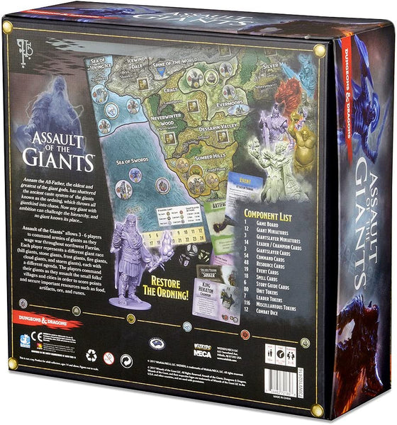 Based on the story first presented in the Storm King’s Thunder adventure from Dungeons & Dragons, Assault of the Giants is a board game designed by Andrew Parks for 3-6 players. Players will need to command armies of giants as they wage war throughout northwest Faerûn. Order your giants to assault small folk villages and cities to score points and secure resources including food, artifacts, ore, and runes.