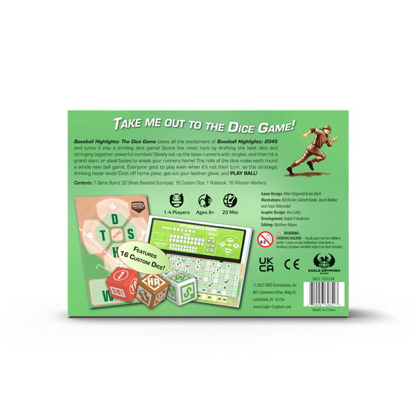 Baseball Highlights: The Dice Game takes all the excitement of Baseball Highlights: 2045 and turns it into a thrilling dice game! Score the most runs by drafting the best dice and stringing together powerful combos! Slowly set up the base runners with singles, and then hit a grand slam, or steal bases to sneak your runners home! The rolls of the dice make each round a whole new ball game. Everyone gets to play even when it’s not their turn, so the strategic thinking never ends! Dust off home plate, get out your leather glove, and PLAY BALL!