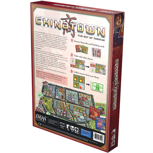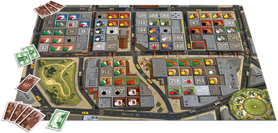 This is a negotiation game in the truest sense of the word. In it, players acquire ownership of sections of city blocks then place tiles, representing businesses, onto the block-sections. At the end of each turn, each tile you've laid gives you some sort of payout, but completed businesses (formed of three to six connected tiles of the same type) pay quite a bit better. All these resources are dealt to the players randomly, however, so players must trade to get matching businesses and adjacent locations.