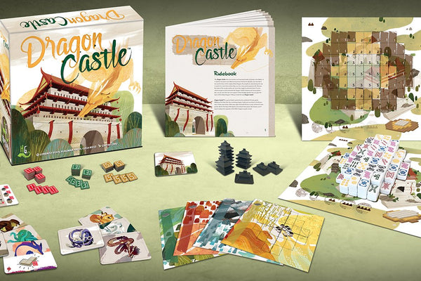 Dragon Castle is a game freely inspired by Mahjong Solitaire. During your turn, you take a pair of identical tiles from the central "castle" (known as the Dragon Castle) and place them on your own realm board to build your own castle. From time to time, you may sacrifice these tiles to acquire shrines in their place.