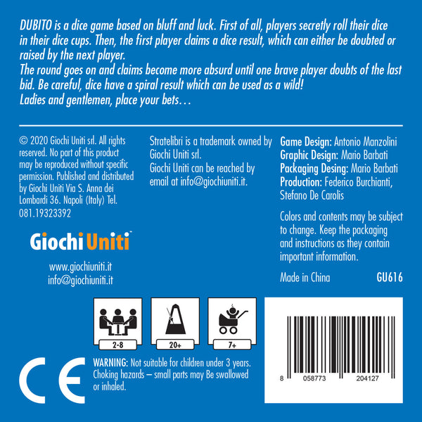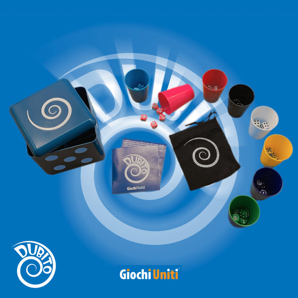 DUBITO is a dice game based on bluff and luck, and very similar to the classic game Liar's Dice. First of all, players secretly roll their dice in their dice cups. Then, the first player claims a dice result, which can either be doubted or raised by the next player. The round goes on and claims become more absurd until one brave player doubts the last bid and says “Dubito.” Be careful, dice have a spiral result which can be used as a wild!
