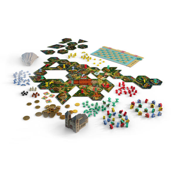 The game features irregular shaped tiles that connect together without a grid to form a village that is completely different every time. The tile placement organically creates interconnecting paths that the villagers use to transport resources across the village. This leads players to construct boards where no two games will ever feel the same. Since the buildings are communal, this also creates a fluid economy, where players are always working hard to provide the village with the resources that are most needed.