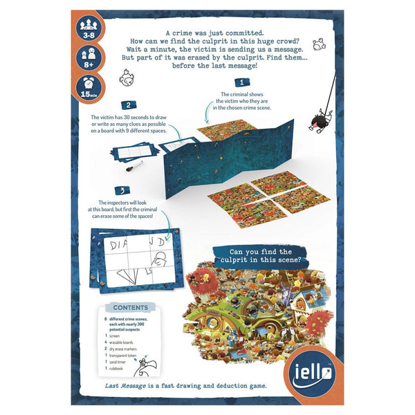In Last Message, the victim of a crime provides you with clues about the identity of the person who did this to them. Their clues are in the form of drawing. However, each turn, the culprit covers their tracks by erasing parts of the clues! Can you find the culprit in the middle of the crowd, with only blurred pieces of a sketch?