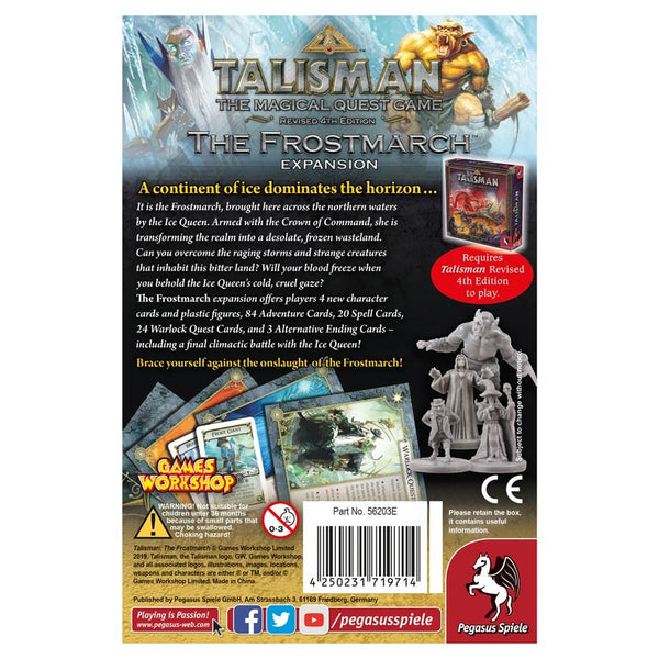 The Frostmarch expansion features 4 new character cards and plastic figures, 84 Adventure Cards, 20 Spell Cards, 24 Warlock Quest Cards, and 3 Alternative Ending Cards - including a final climactic battle with the Ice Queen.