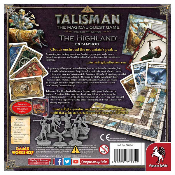 Talisman: The Highland adds a new Region to the game for heroes to explore. A custom-fitted map board and over 100 new cards bring this mountainous realm vividly to life, while six brand-new characters, each represented with a superbly detailed plastic miniature, offer fantastic new playing experiences. Climb as high as you dare, and lay claim to the unimaginable wealth that awaits atop the tallest peak in the world of Talisman!