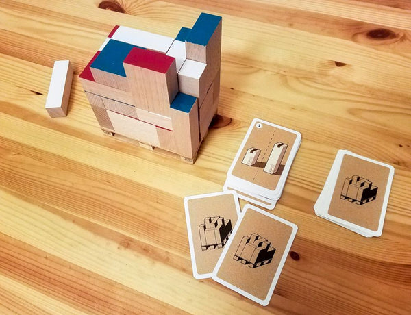 The game is cooperative, with players teaming up to pack the most compact pallet possible. You draw cards that indicate the color or shape of a box, and that's the type of box you have to stack next. The game proceeds until there are no more boxes to stack or until the players decide it is best to stop to avoid penalties. Scoring takes into account three factors: the number of full rows on the pallet, the number of boxes that aren't stacked on the pallet at the end, and the number of penalty points (from cards you draw but cannot play). The best score is 25. The perfect solution exists, but will your team find it?