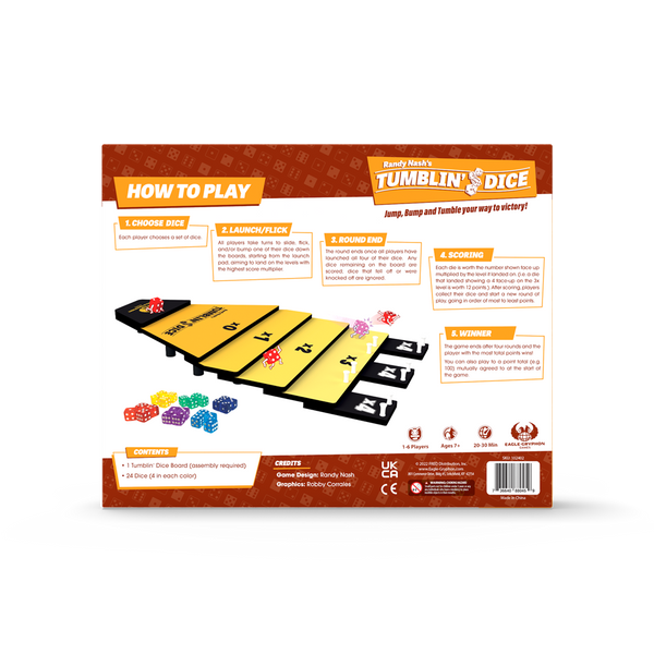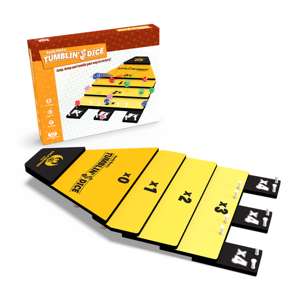 Tumblin' Dice is a dexterity dice game in which players take turns sliding, rolling, or flicking one of their dice down stepped surface. After all players have launched their four dice, they score points, multiplying the value of the die roll by 1×, 2×, 3×, or 4× depending on which area of the board the die has landed. (Dice which land in the 0× region are immediately removed from play.) After four rounds, the player with the most points win.