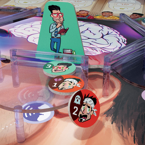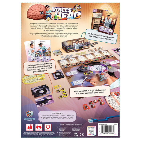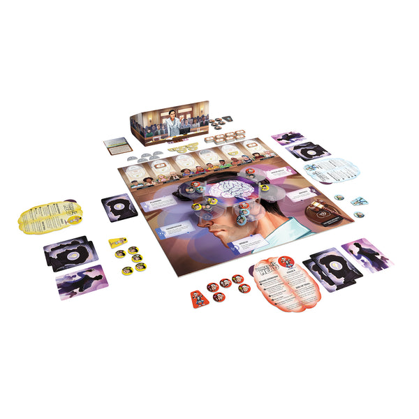 Players take part in controlling the mind of Guy, a criminal caught robbing a bank. Players compete over the sensory parts of his brain in order to advance their secret agenda. Will the prosecutor be able to present all the evidence convincingly and put Guy away, or will one of the other hidden roles achieve their goal and get Guy off scot-free?
