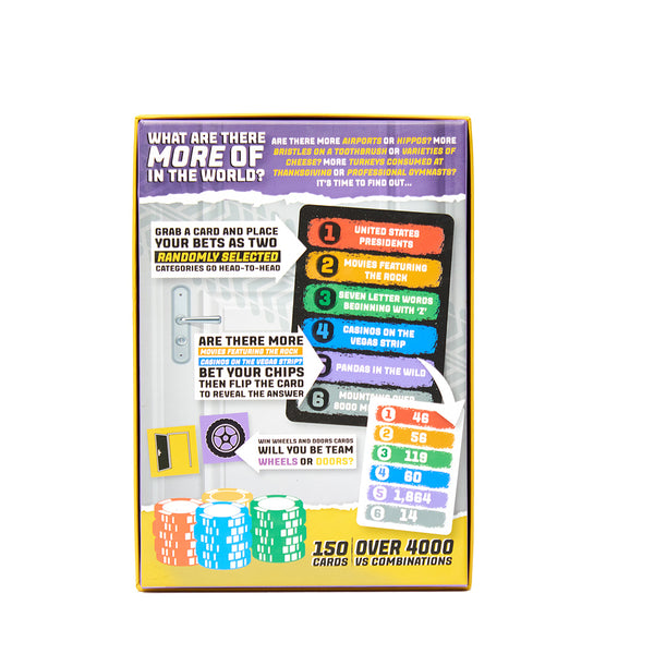 You will have 5 poker style chips, start with 3 wheel and door tokens, and will be asked what you think there is more of in the world, and will be comparing two things each time. The statistics are randomly generated and brilliantly random.