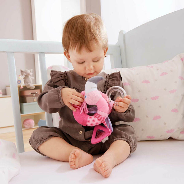 Look, feel, grasp and listen: with its various acoustic and tactile effects, this funny clutching figure stimulates baby’s senses in so many different ways. Flamingo Gustav helps to develop fine motor skills via the medium of play. Its coiled shape makes it easy for little children’s hands to grab hold of. It is also perfect for attaching to infant carrier, cot and buggy.