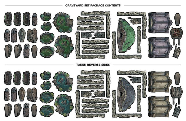 Over 30 unique tokens included. Graves, headstones, bogs, stone walls and coffins; everything you need to outfit your battlemap with a graveyard and crypt setting.