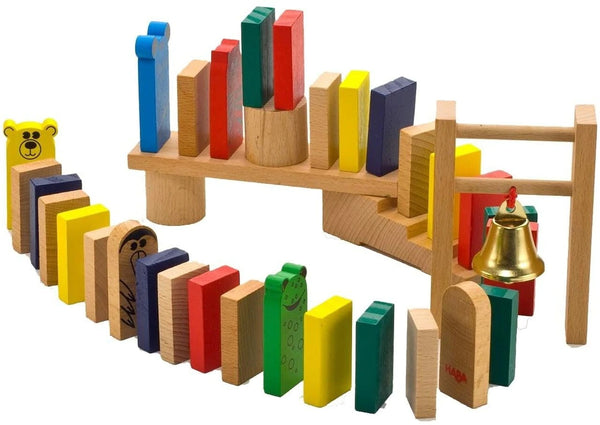 Keep your hands steady with our Go-Go Dominoes. There's nothing that will excite your kids more than the pushing that first piece to start a colorful chain reaction. It's a bonus if they can ring the bell included! The colorful pieces include animal theme domino's to add some 'character' to your story and round pillars to act as supports for the included climbing staircases. Includes 204 dominos, 24 animal dominos, 12 round pillars, 6 staircases, 2 bridges, 1 bell structure. Compatible with all other HABA Building systems and marble run sets.