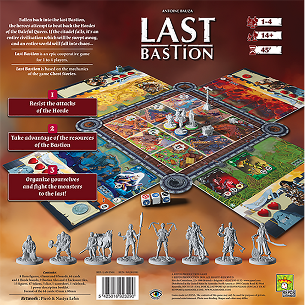 In Last Bastion, players struggle against the game together. Either they are all victorious, or they all suffer defeat. Players take on the roles of heroes defending an ancestral Bastion against the monstrous hordes of the Baleful Queen. To claim victory, they must vanquish the Warlord to stop the assaulting forces.