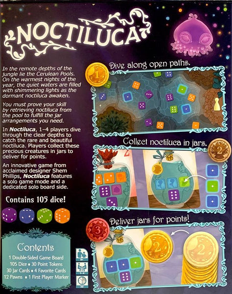 In Noctiluca, 104 colorful translucent dice fill the pool on the game board to represent the different glowing noctiluca. Players take turns diving into the water from the edges of the shore to collect the noctiluca dice from the board and keep them safely in jars until they can deliver them to healers. After two rounds, players compare points from their successful deliveries and the player with the most points wins.