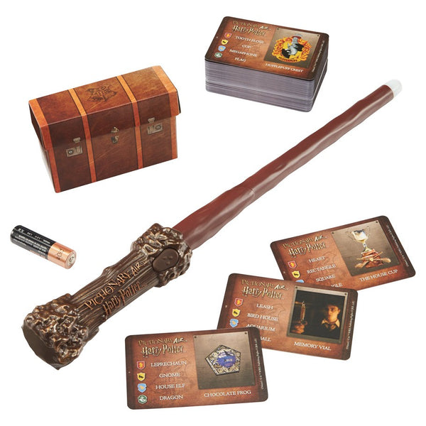 Get ready for a spellbinding twist on the classic family drawing game with Pictionary Air™ Harry Potter™. Draw in the air and see it on screen in this enchanted game that will delight Witches, Wizards, and Muggles™ alike! Each team chooses which Hogwarts house they will play for (Gryffindor, Hufflepuff, Slytherin or Ravenclaw). Open the collector box to discover a Pictionary Air™ pen in the shape of Harry Potter's famous wand, a card holder inspired by Harry's trunk and 112 double-sided clue cards with clues inspired by the Wizarding World™. Download the free Pictionary Air™ app to your smart phone or tablet to get started(Data rates may apply). Compatible iOS or Android smart device and app are required to play. Point the in-app camera at the illustrator and they'll appear, along with their sketch, on the screen of your smart device. For an even more magical game, players can cast their drawings from their smart device to their TV using Apple TV, Chromecast or a similar streaming device. Compatible streaming device required to stream game to TV. Compatible devices may change. This family game brings fantastical fun to any game night or party. Colors and decorations may vary