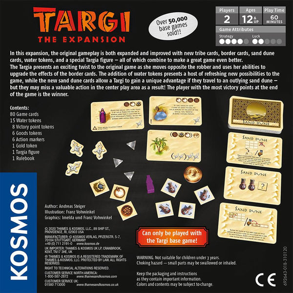 In this expansion to the hit game Targi, the original gameplay is both expanded and improved with new tribe cards, new border cards, water tokens, and a special Targia pawn — which all combine to make a phenomenal game even better.