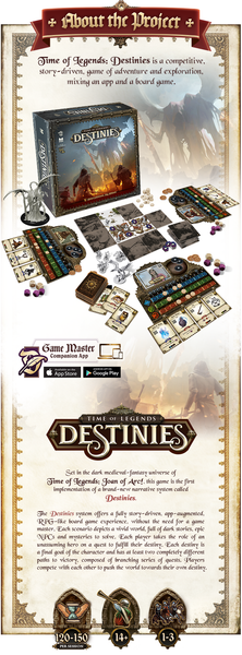 Time of Legends: Destinies is a competitive, story-driven game of adventure and exploration, mixing an app and a board game. The new Destinies system offers a fully story-driven, app-augmented, RPG-like board game experience, without the need for a game master. Each scenario depicts a vivid world, full of dark stories, epic NPCs and mysteries to solve. Each player takes the role of an unassuming hero on a quest to fulfill their destiny. Each destiny is a final goal of the character and has a least two completely different paths to victory, composed of branching series of quests. Players compete with each other to push the world towards their own destiny.