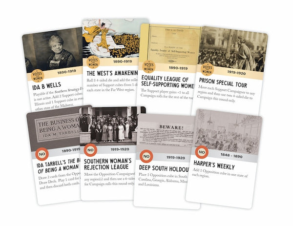 The deck of over 100 stunning cards feature period art, portraiture, and historic documents and include event instructions that can either be played or discarded to campaign or organize their side of the issue. Campaigners move across the premium mounted map to distribute political capital with a roll of the included dice that will determine whether each state votes to ratify the amendment or opposes the Vote after three eras of play. Dig deeper into the history and maneuver through the critical choices that suffragists faced for a chance to guarantee equal franchise for all and win Votes For Women!