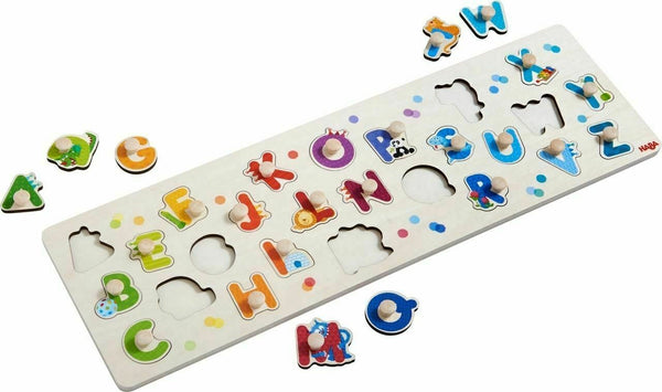 A, B, C, D, E, F, G... This colorful clutching puzzle encourages children to learn the alphabet by puzzling the large, easy to grasp knobs into the puzzle frame, while fostering fine motor skills and shape and color recognition.