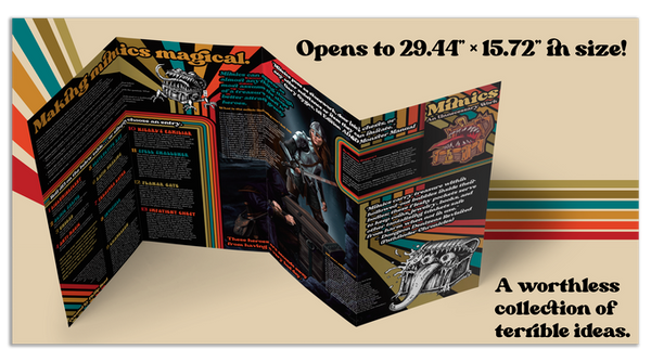 This cool accessory for any fantasy RPG is loaded with encounter tables for dastardly dangerous dungeons! The "pocket map" format starts at approx 5" x 6", then impressively folds out to a double-sided, poster-sized informational document that's over 29" wide and almost 16" tall when completely opened up.
