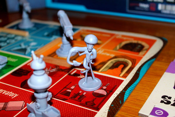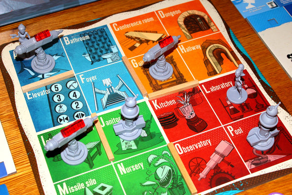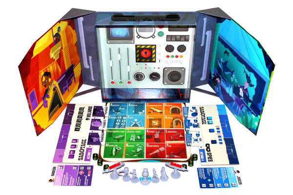 Sabotage is an asymmetric stealth game for two teams of two players each. One team, the villains, are trying to take over the world with their doomsday devices. The other team, the spies, are infiltrating the villains' secret lair to stop them. The spies must use their stealth and cunning to shut the villains down without getting caught. The villains must use their deductive reasoning and a massive stockpile of weapons to prevent the spies' subversion. 2-4 players, ages 10+, 60-90 minutes