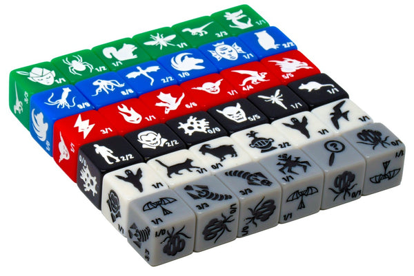 This set contains one of each unique token die (in black, blue, green, red, white, and grey) plus 1 generic token die in a random color.