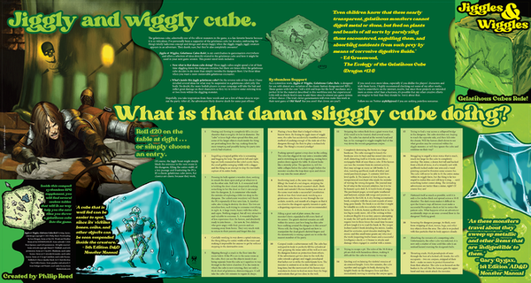 This cool accessory for any fantasy RPG is loaded with info and tables about your favorite gloopy mass, the Gelatinous Cube! The "pocket map" format starts at approx 5" x 6", then impressively folds out to a double-sided, poster-sized informational document that's over 29" wide and almost 16" tall when completely opened up.