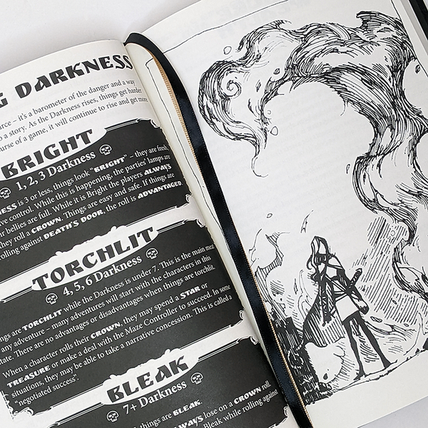 MAZES quietly hit the indie TTRPG scene over two years ago during the first Kickstarter Zinequest event. Now they’ve brought together years of development work on the underlying game system and its pulpy, dark fantasy world to bring players this definitive hardcover edition of this modern Fantasy Role Playing experience.