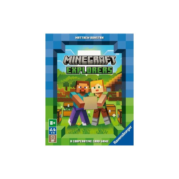 In Minecraft Explorers, players explore the blocky landscape together looking for hidden treasure. On your turn, you have action points to spend as you wish. You can explore different landscapes to discover what's on the back of a tile. Pickaxes and swords make some explorations easier, so perhaps you want to get them. Try to uncover the treasure you need to win. Ideally you can avoid monsters such as Zombies, Creepers, and Endermen because at the end of each turn, you must reveal a monster card, and if this monster is already in play, your group will be overrun and more monsters will appear. Face the horde bravely because as soon as the monster cards are used up, you lose the game. Do you best to fill your chests with treasure before that happens.