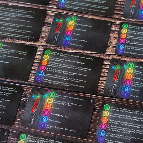 Test your proficiency with a range of inquiries related to everything from alignment (“What does your alignment change to if you equip the Eye or Hand of Vecna?”) to real-world facts (“Who were the two authors of the original 1974 Dungeons & Dragons game?”) according to traditional Trivial Pursuit rules. Content related to specific point totals, formal spell names, relic descriptions, and more can be expected among the limitless details players will recall of the expansive and nostalgic multiverse.